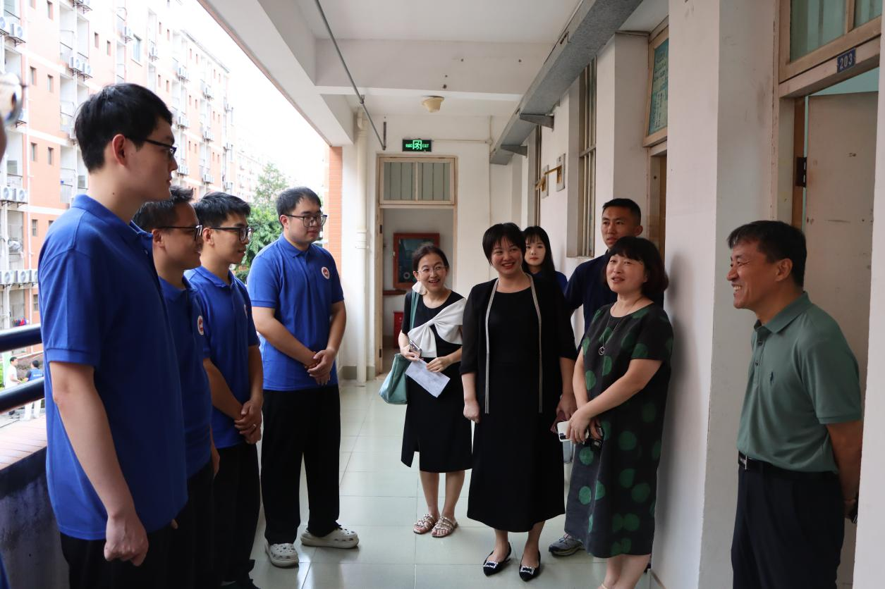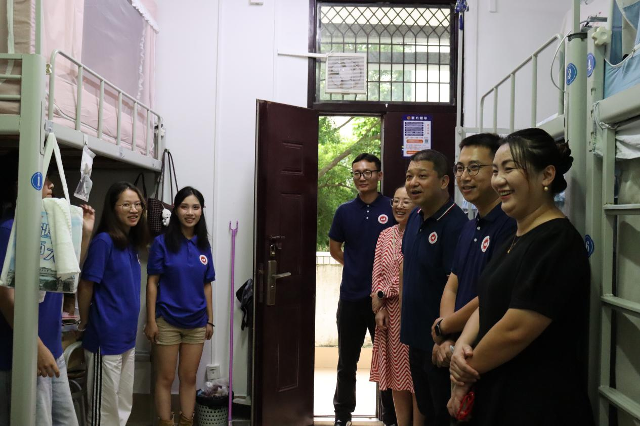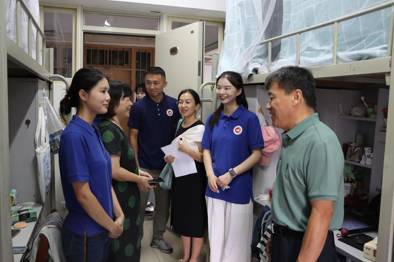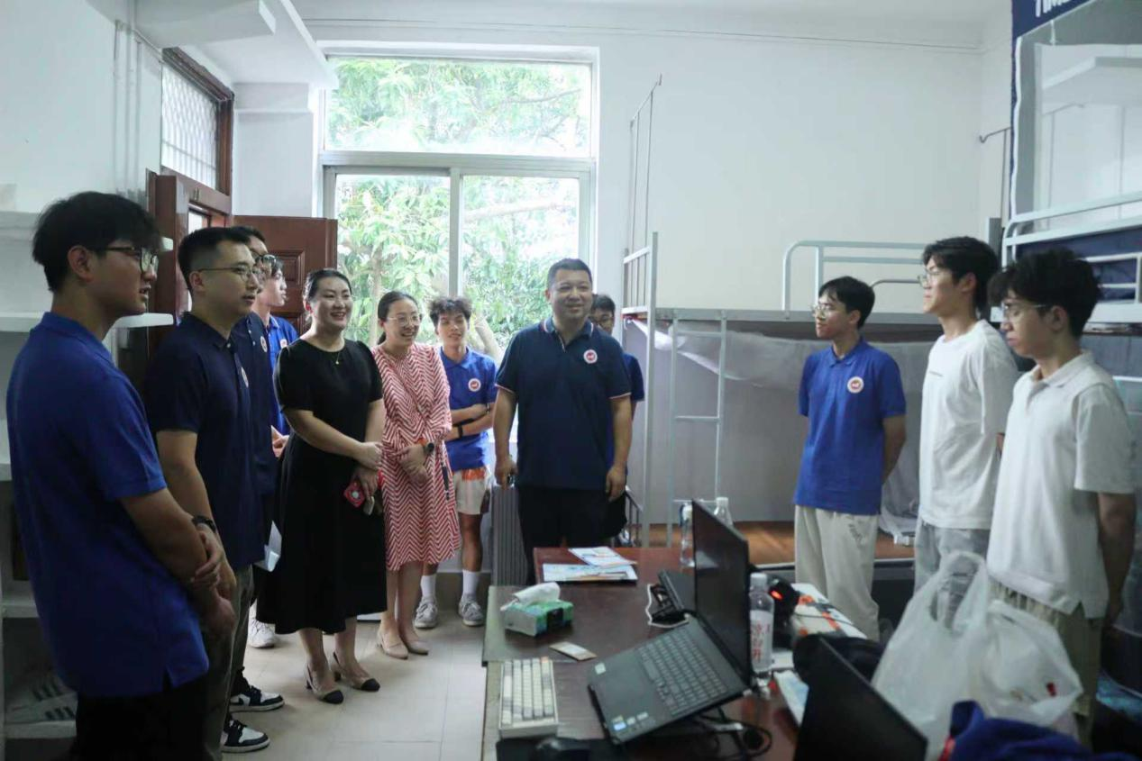 领导细致查看每一间宿舍的设施条件与居住环境,关切询问同学们的生活适应情况,耐心倾听初入校园的所思所感。领导老师们与新生亲切交谈,从家乡风土到入校体验,从学业规划到自我成长,言语间尽显关怀。他们勉励同学们要尽快适应新角色、融入集体生活,与室友彼此扶持、共同进步,既要专注学业、夯实专业基础,也要勇于尝试、积极参与各类实践与社团活动,在多元平台上拓展视野、锤炼综合能力。
