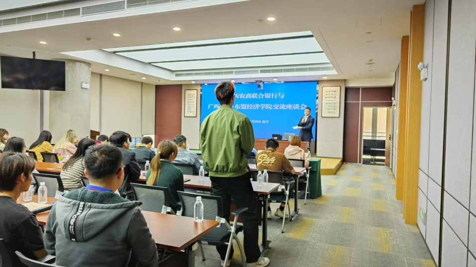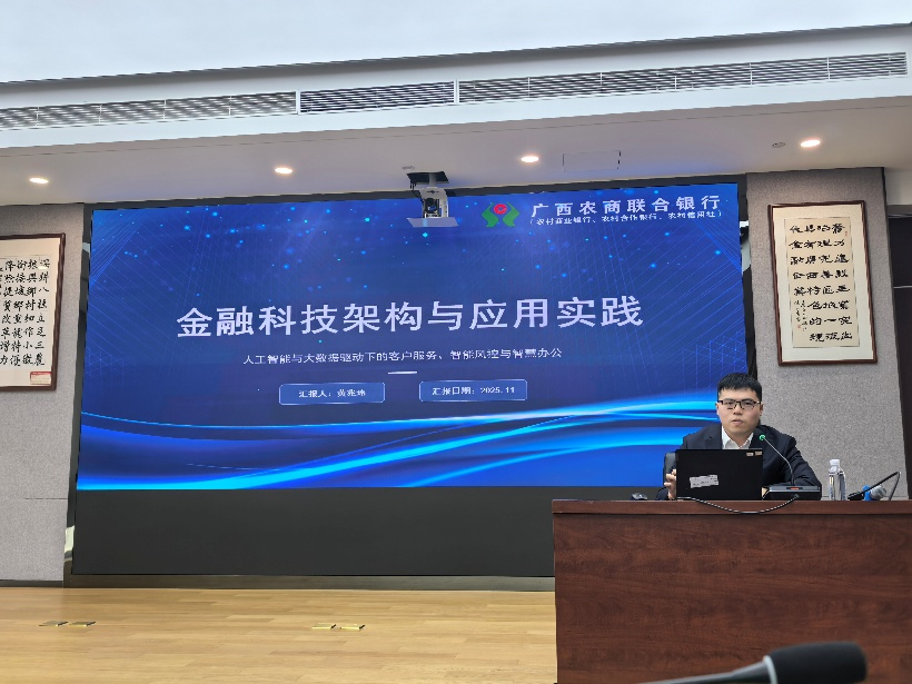 此次课程实践还安排了讲座环节,把“课堂”真正搬到了银行一线。讲座环节由各业务部门老师依次分享:人力资源部概括介绍主要岗位和用人标准,让同学们初步了解银行的职业发展路径;金融市场部简要讲解银行在金融体系中的枢纽作用及主要风险;公司机构金融部聚焦科技金融、绿色金融的核心业务和典型案例;桂盛金科公司则用生动案例展示人工智能、大数据、区块链在风控和客户服务中的具体应用,让《金融科技学》课程中学到的概念真正“落地”。