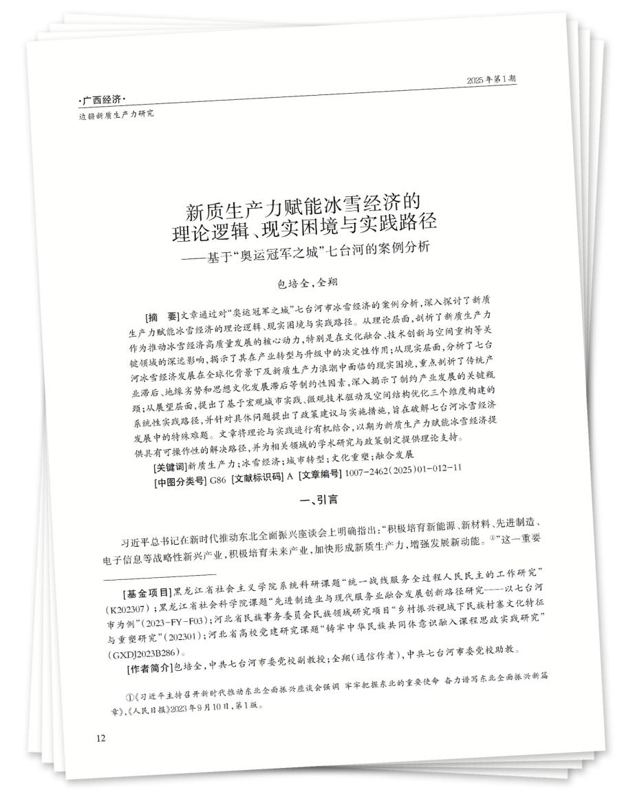 [摘 要]文章通过对“奥运冠军之城”七台河市冰雪经济的案例分析,深入探讨了新质生产力赋能冰雪经济的理论逻辑、现实困境与实践路径。从理论层面,剖析了新质生产力作为推动冰雪经济高质量发展的核心动力,特别是在文化融合、技术创新与空间重构等关键领域的深远影响,揭示了其在产业转型与升级中的决定性作用;从现实层面,分析了七台河冰雪经济发展在全球化背景下及新质生产力浪潮中面临的现实困境,重点剖析了传统产业滞后、地缘劣势和思想文化发展滞后等制约性因素,深入揭示了制约产业发展的关键瓶颈;从展望层面,提出了基于宏观城市实践、微观技术驱动及空间结构优化三个维度构建的系统性实践路径,并针对具体问题提出了政策建议与实施措施,旨在破解七台河冰雪经济发展中的特殊难题。文章将理论与实践进行有机结合,以期为新质生产力赋能冰雪经济提供具有可操作性的解决路径,并为相关领域的学术研究与政策制定提供理论支持。