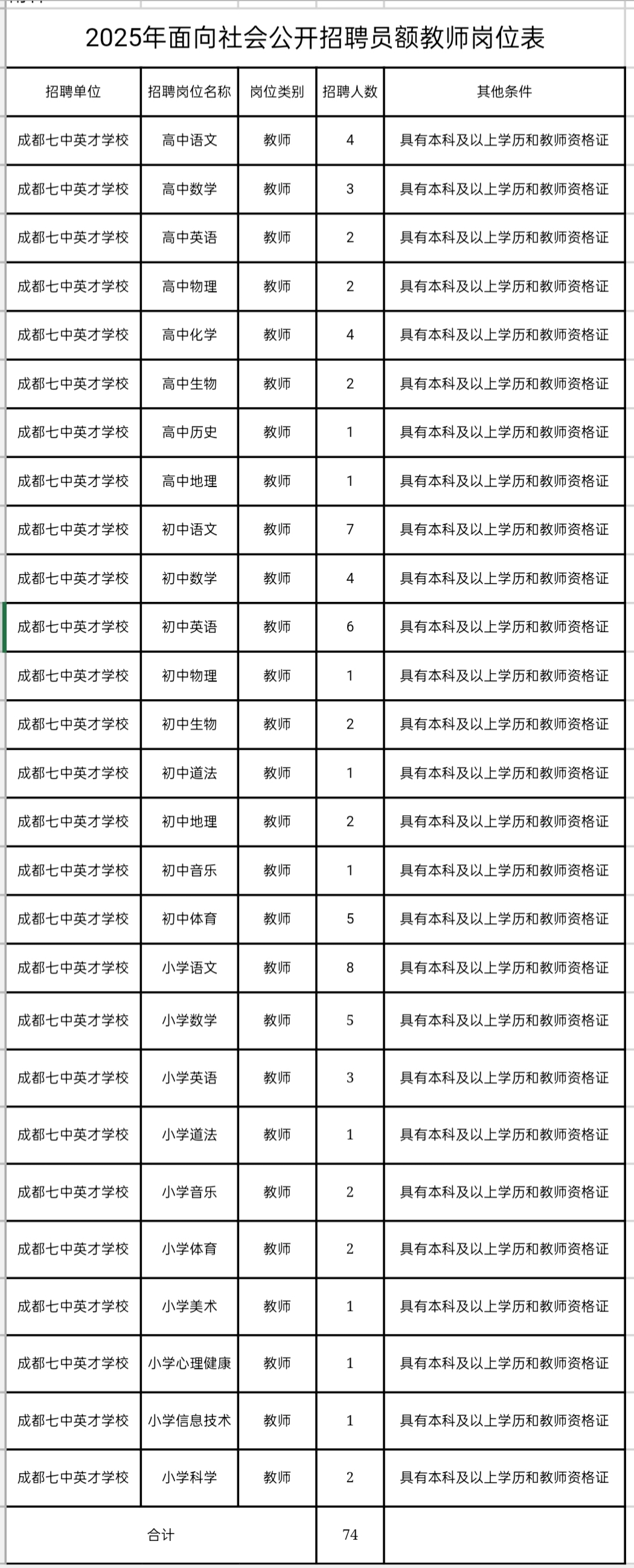 招聘岗位资格条件的人员,具体要求详见成都七中英才太阳城App
