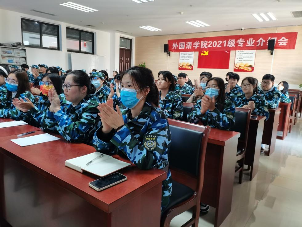对2021级全体新生表示热烈欢迎。随后,各专业老师结合自己的专业特色,简要介绍了各专业的发展历程和建设成果,并从师资力量、课程设置、培养目标、第二课堂活动等方面详细分析了各专业的专业优势和就业前景。接着,老师们通过分享和总结自己的教学经验,为大家明确指出大学期间的学习目标和学习任务,也介绍了有关各专业考证和考研的明确信息并给出了合理的安排和建议。同时,他们鼓励同学们积极参加有意义、高质量的英语比赛,锻炼和提升自己的实践能力,并建议大家劳逸结合,坚持锻炼身体,保持良好的身体素质。随后,在答疑互动环节,老师和同学们进行了更深层次的交流,并对同学们的疑问进行了耐心解答。最后,老师们表达了对新生的殷切希望和美好祝福,希望他们能够坚守初心,刻苦努力,学有所成,未来可期。在同学们热烈的掌声中,本次会议圆满结束。