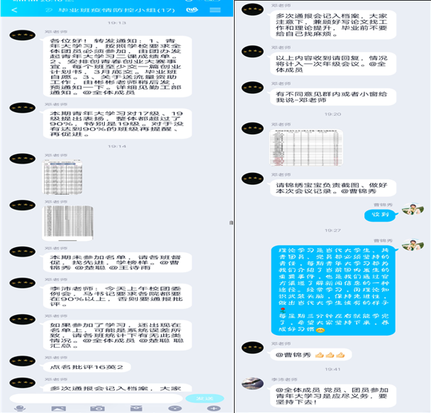 “青年大学习”的学习情况,同时对于参与率较低的班级进行督促和提醒,要求各班学生加强对“青年大学习”的重视,不断提高自身思想觉悟和政治素养,努力站在时代发展前列。随后,她安排了创青春、创业大赛相关事宜,鼓励学生积极参加比赛,培养创新意识、启迪创新思维、提升创造能力。接着,她传达了疫情期间流量资助相关通知,希望同学们感受到国家给予的温暖和关怀。最后,邓然寄语大家疫情期间合理统筹规划,严格要求自我,做到论文撰写与工作实习两不误。