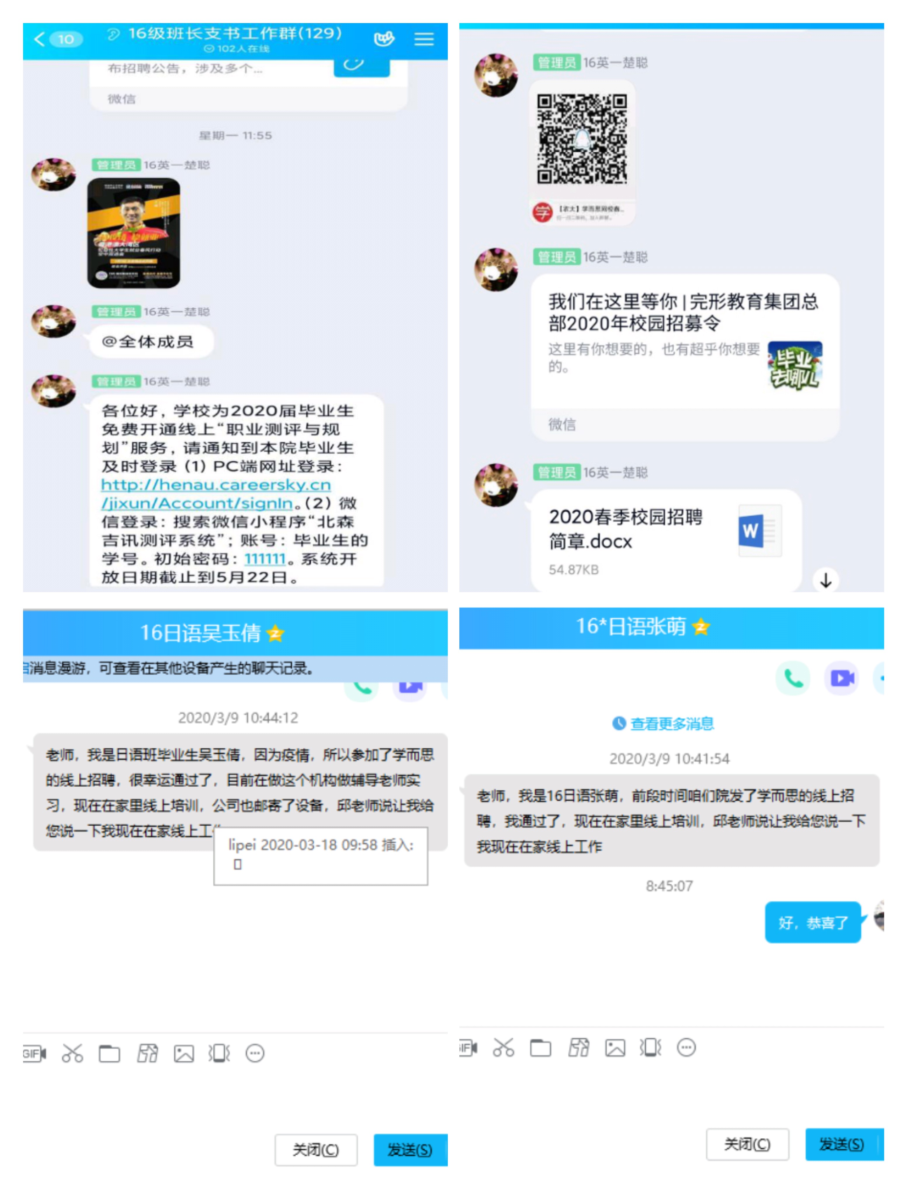 筹建了毕业生工作领导小组,由邓然老师、院学生会、推免生具体负责开展网上双选会等系列毕业生就业、服务、帮扶活动,为毕业生提供就业指导,拓宽就业渠道,减轻毕业生因疫情而产生的就业压力,帮助毕业生顺利就业。截止目前,院学生会通过网络邀请了30余家用人单位来太阳城App