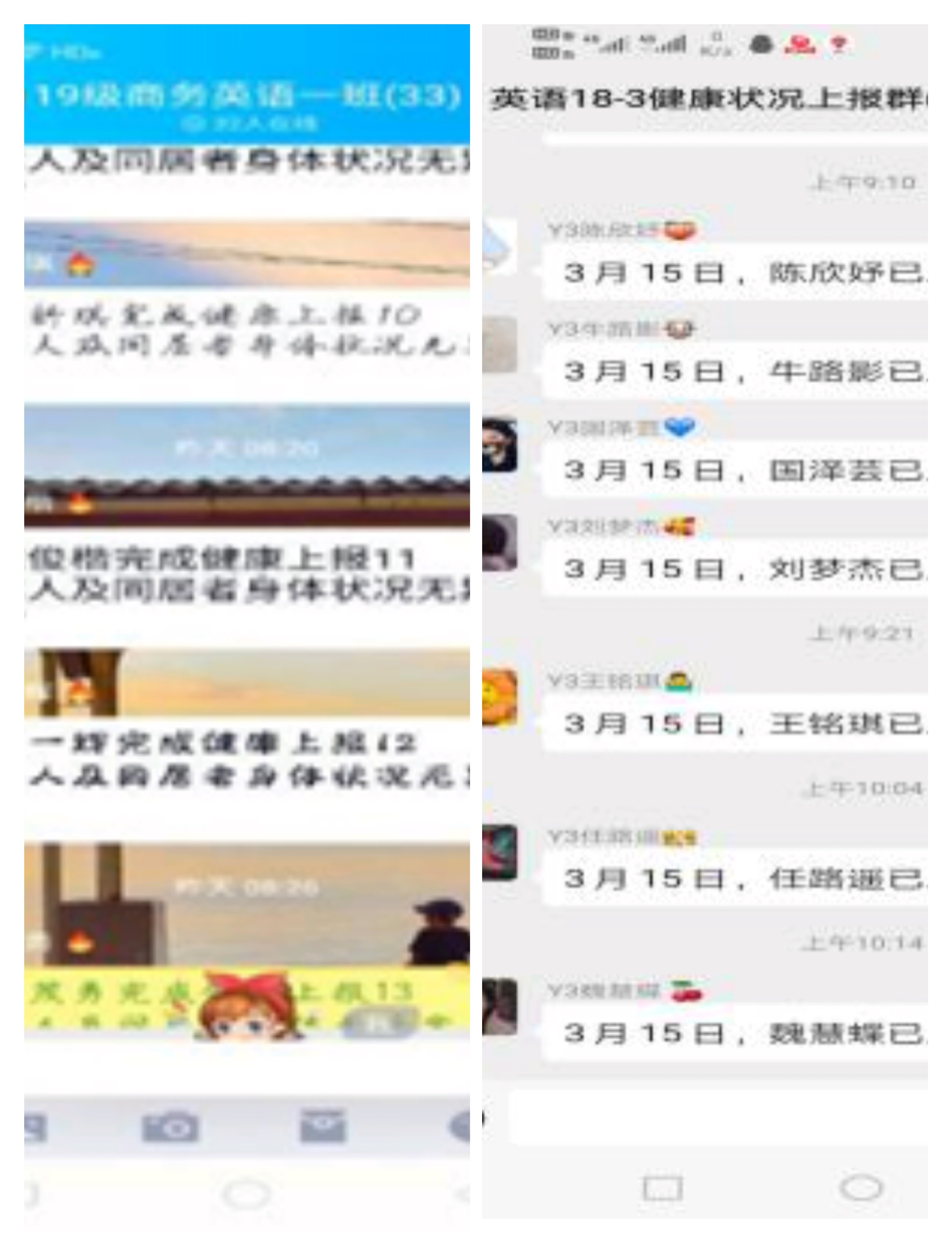 严格按照校党委学工部的安排每天下午16:00前上报各班的学生的身体状况的报告,时刻更新学生的身体健康信息,加强疫情摸排、掌控学生在家出行轨迹,严格做到不漏报、不瞒报。