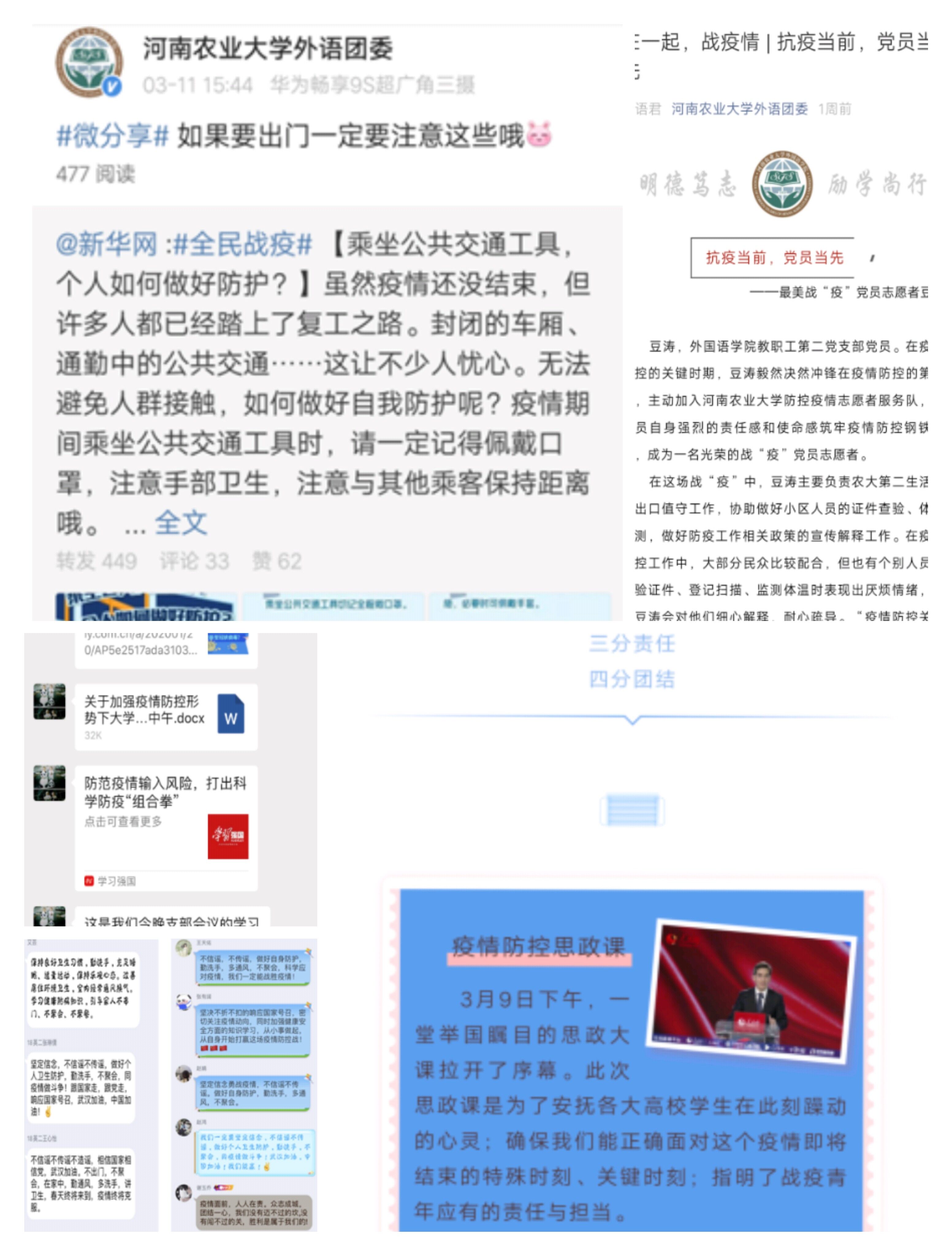 有效利用网络资源,通过QQ群、微信、学习强国、青年大学习等平台组织学习防疫知识,引导学生理性认识疫情,做好科学防护。分享战“疫”事迹。通过分享18MTI陈亚婷、18英二申子辰等太阳城App