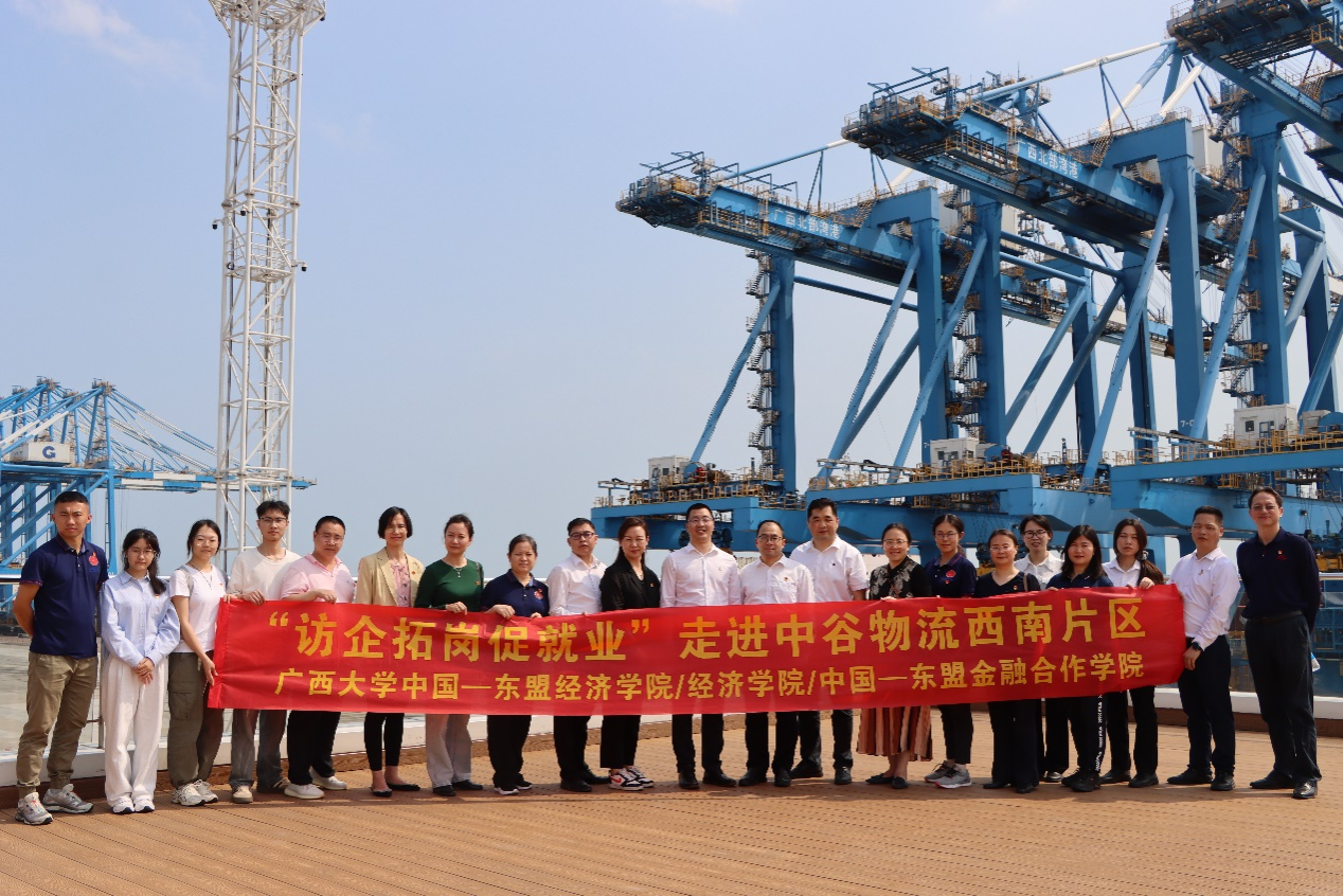 为积极探索党建联学共建引领校企协同发展新模式,4月25日,广西大学经济学院党委常务副书记罗诚带队赴中谷物流西南片区总部(钦州)开展党建联学共建暨“访企拓岗促就业”活动,经济学院副院长公正,中国—东盟研究院/广西创新发展研究院副院长曹蕾,以及经济学院经济学系、国际经济与贸易系、边疆经济学系、行政组、学工组,东盟研究院/创发院的党员教师代表和学生代表参加活动。中谷物流西南片区总经理助理陈娇、张磊等公司骨干团队成员出席本次交流活动。