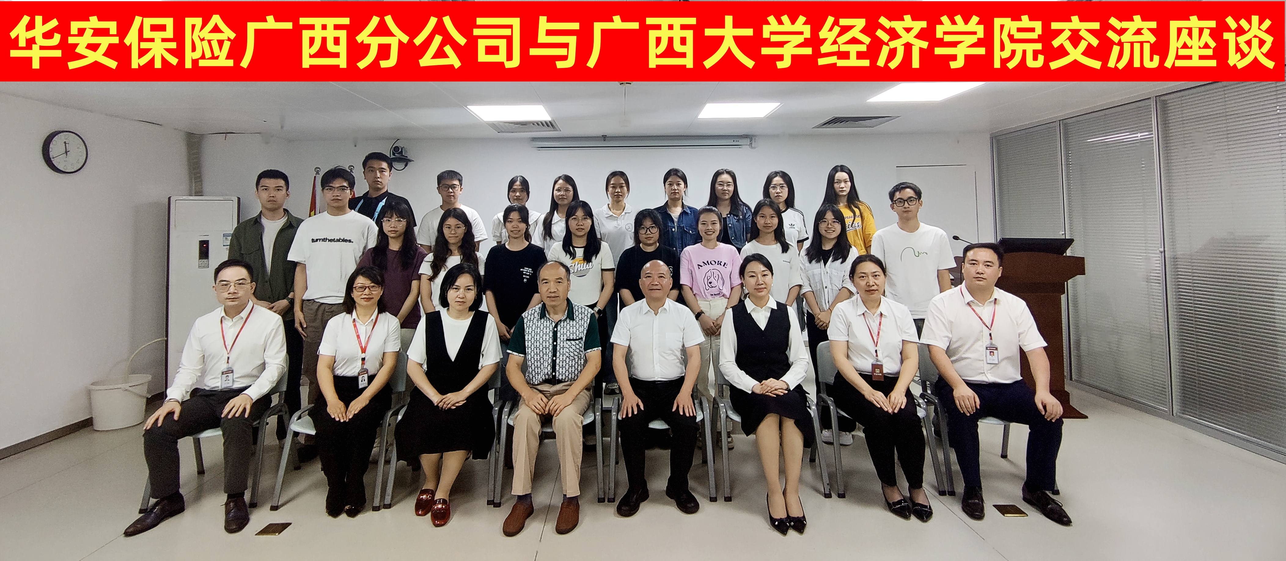 唐金成教授、莫国莉副教授和2023级保险专硕全体同学一行到华安财险广西分公司交流学习。华安财险广西分公司总经理张华、副总经理冯艳、人力资源部经理王吕云、人身险部经理沈海林、创新业务部经理李娜、客户服务暨消费者权益保护部经理助理李旭出席本次交流会。