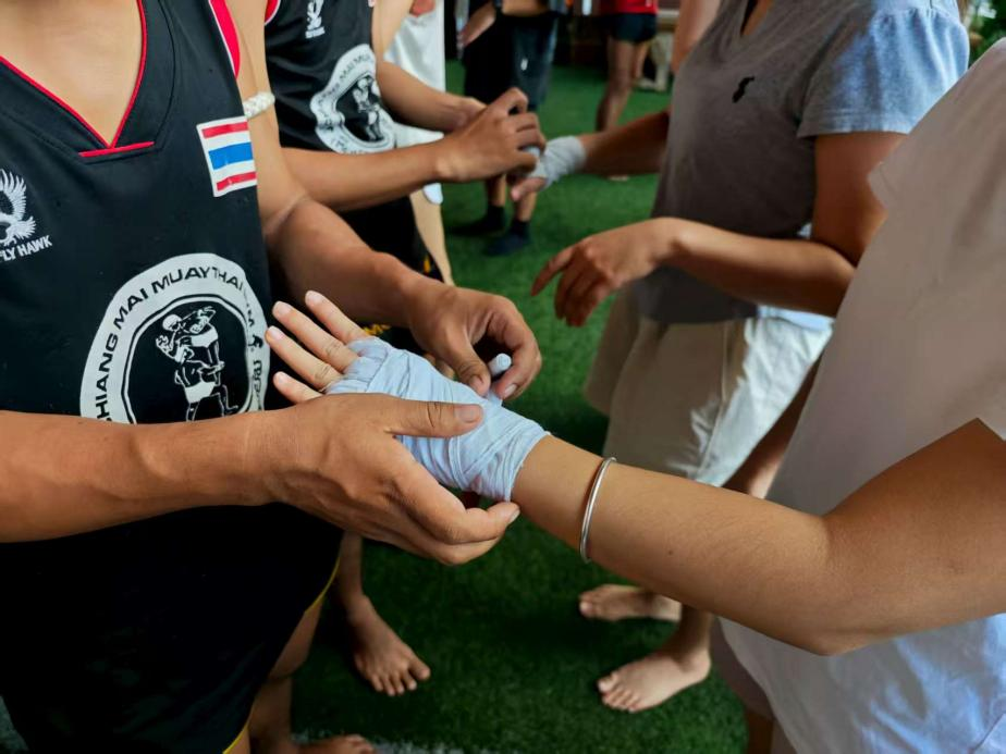 在基础防护环节,学员系统学习绷带缠手(Hand wrapping)技术,通过八层专业缠绕法构建手部防护体系。该环节既有效降低运动损伤风险,亦使学员深刻体认泰拳“安全优先”的竞技理念。
