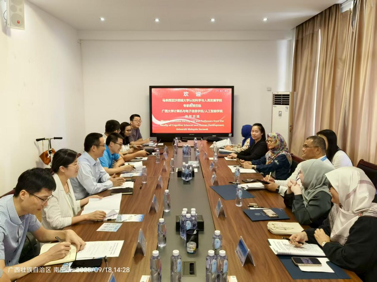 马来西亚沙捞越大学代表团由首席数字官万·哈希姆·万·易卜拉欣先生率领,成员涵盖经济与工商、可持续发展、认知科学与人类发展等多学科专家。广西大学组织了跨学科、跨领域的专家团队与会,涵盖人工智能、计算机科学、经济学、金融学等多个研究方向。双方研究领域高度互补,交流气氛热烈融洽,展现出强烈的合作意愿。