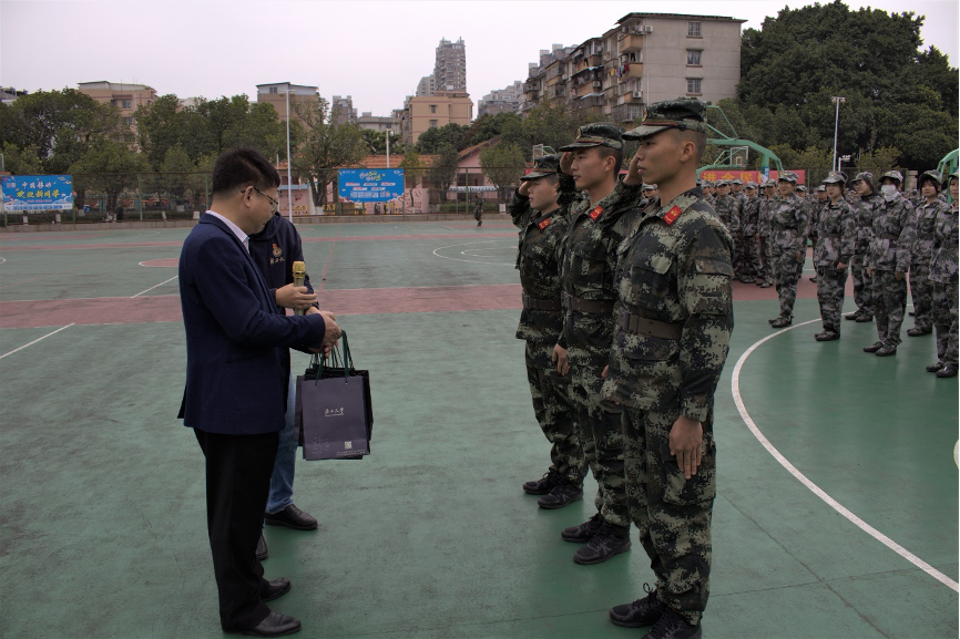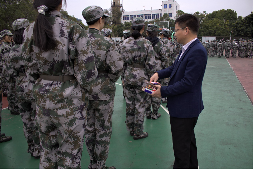 领导老师们向军训教官和每位学员发放慰问品,并致以亲切的问候与关怀,勉励大家勇于磨练自我、超越自我,圆满完成军训任务!