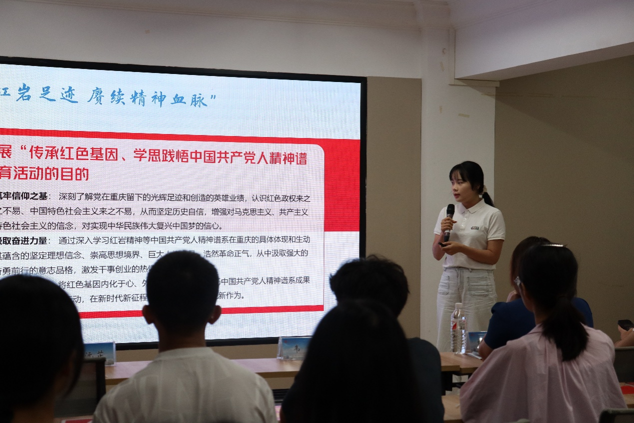 2024级硕士研究生李沅芷同学以“追寻红岩足迹,赓续精神血脉”为题发表演讲,阐释了团队赴重庆开展宣传教育活动的目的。她分享道,青年应将个人成就融入国家发展,具备创新精神和全球视野,同时做到知行合一,深刻理解红岩精神的当代意义。