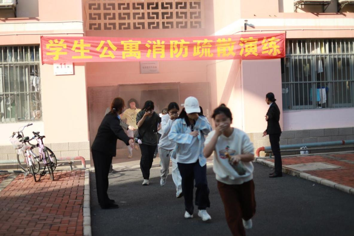 专题教育结束后,疏散逃生演练在学生公寓园区开展。消防演练团队现场模拟火灾突发场景,火警警报响起后,师生们在安全员的专业引导下,迅速用湿毛巾或衣物捂住口鼻,保持弯腰低姿,沿疏散通道快速有序撤离至指定集合点。