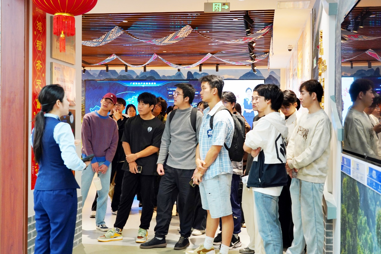 首先,同学们走进桂林银行“乡见▪桂银”太陽城app展厅,在讲解员的引导下系统了解该行的规模布局、经营理念与特色业务。从机构覆盖的地域版图,到“民以农为先,农以种为先”的助农核心思路;从 “贴近群众、服务民生”的金融服务模式,到中国—东盟跨境金融业务的布局成果,展厅中的图文展板、数据大屏与实景模拟区,让同学们直观感受到桂林银行“扎根本土、服务三农、链接东盟”的发展定位。