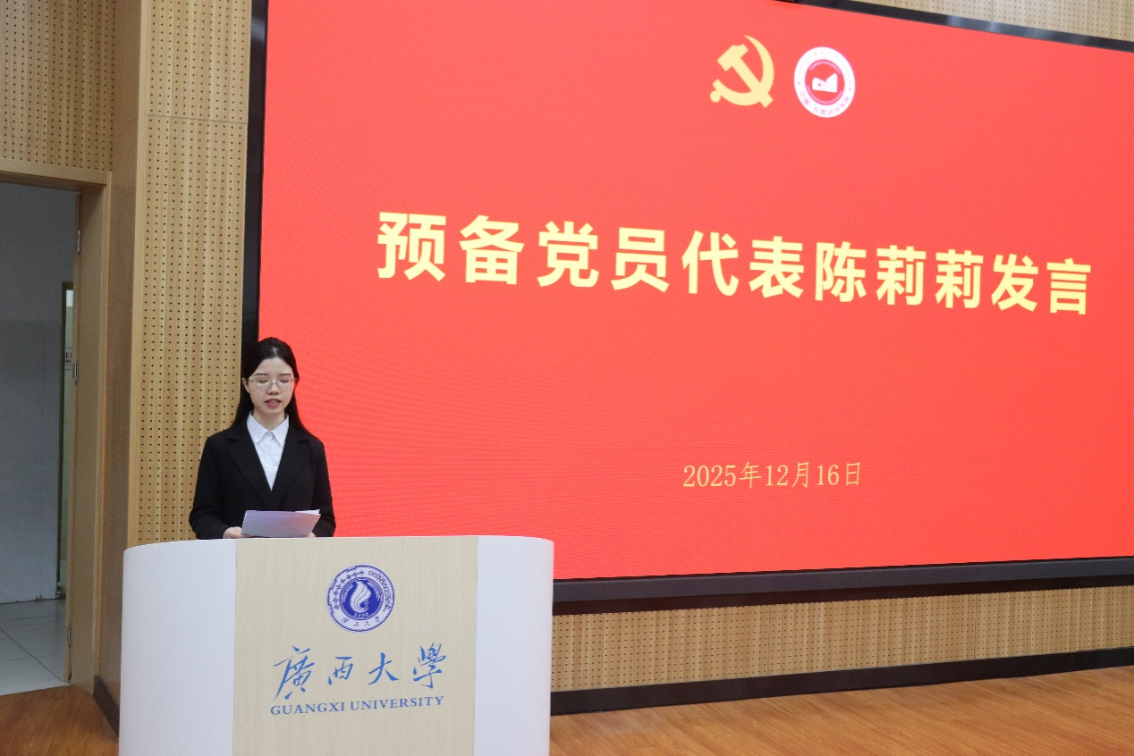 2025年12月16日,广西大学中国—东盟经济学院/经济学院/中国—东盟金融合作学院在庄严的党旗下,隆重举行2025年新党员入党宣誓仪式。学院党委副书记刘梦娟出席仪式,全体新党员及部分师生党员代表共同见证了这一庄严而光荣的时刻,仪式由陈伊洁主持。